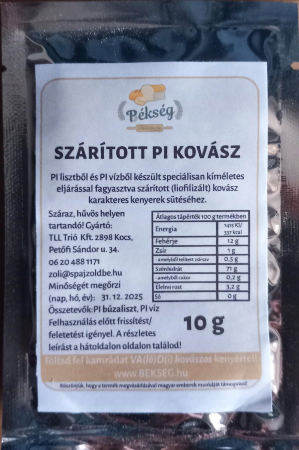 Kovászod aktiválása: 1. Végy kézhez egy tisztára mosott befőttes üveget vagy olyan tálat, amelynek van teteje. 2. Öntsd bele a zacskó (10g) kovászport. 3. Adj hozzá 75 g lisztet (Pi-technológiás) és 75 ml vizet (pi-víz), majd jól keverd össze. 4. Takard le az edényt/üveget, de ne zárd le teljesen légmentesen, mert éréskor minimális mennyiségű szén-dioxid szabadul fel. 5. Ezután 1 napra (24 óra) hagyd állni a keveréket szobahőmérsékleten. Ne ijedj meg, ha az első nap után még nem tapasztalsz nagy változást, a kovásznak időre van szüksége ahhoz, hogy újra ereje teljében legyen! 6. Ha letelt a 24 óra, ismét adj hozzá 75 g lisztet és 75 ml vizet és tartsd szobahőmérsékleten újabb 24 órát. 7. Ezután a kovász használatra kész! Javaslat: ha szeretnél vele azonnal sütni, tedd félre a felét (150 g-ot), és a maradékot ismét etesd fel 75 g liszttel és 75 ml vízzel. 3-5 óra elteltével dagaszthatsz is a friss kovászoddal.