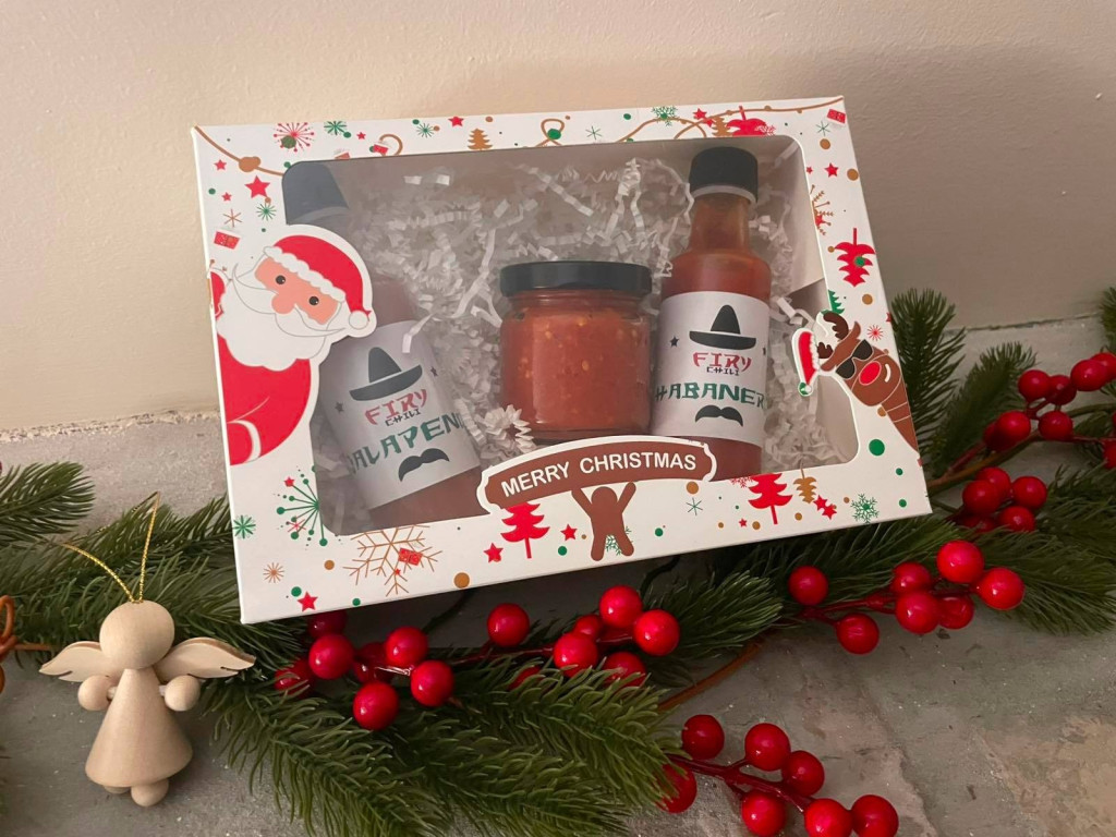 Karácsonyi chili ajéndékcsomag Tartalma: 1 db Jalapeno szósz (csípősség 10/3)  100ml 1 db Habanero szósz (csípősség 10/6)   100ml 1 db Jalapeno krém (csípősség 10/3)  100g