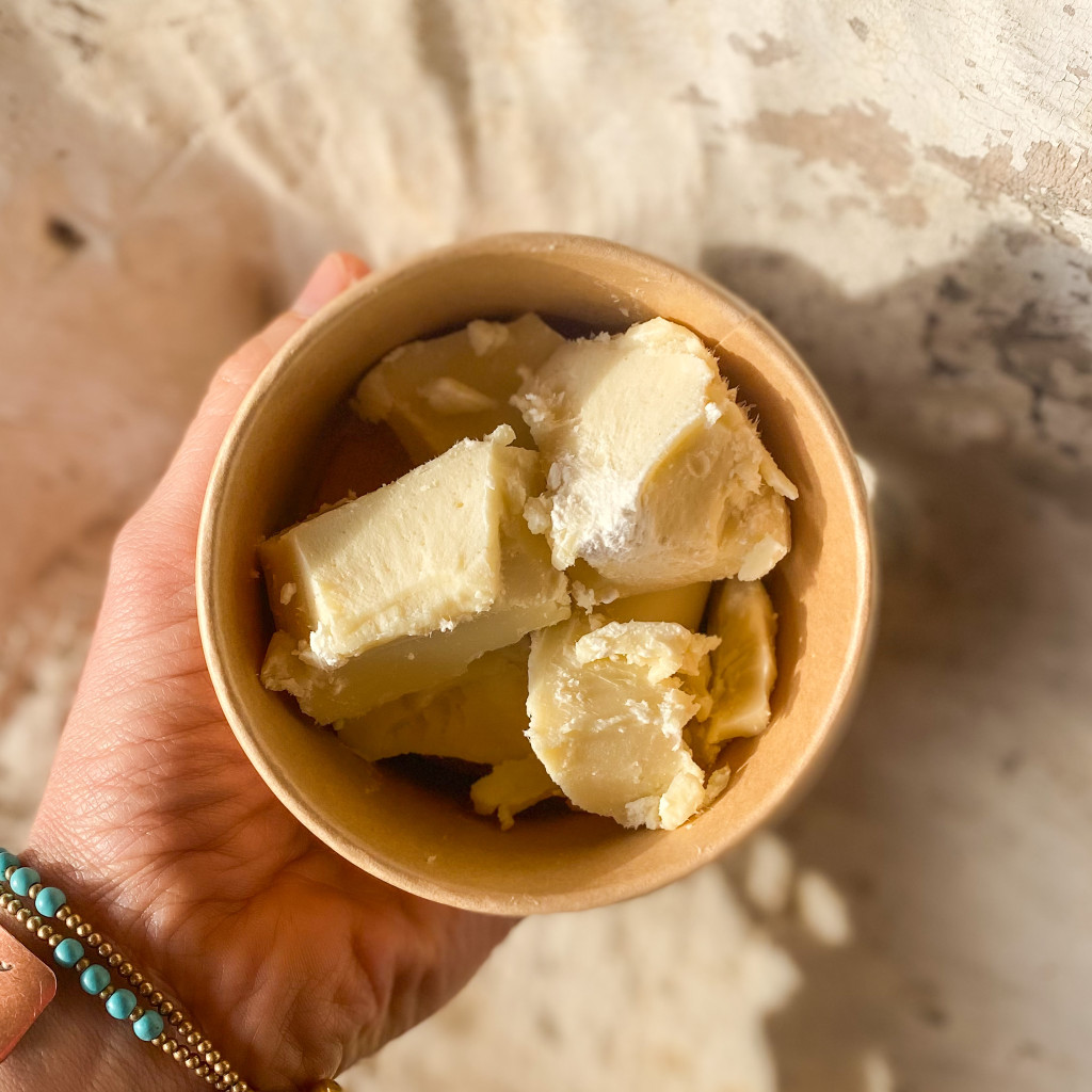 - Az ujjbegyeddel addig dörzsölsz, „masszírozol” egy shea darabot, amíg elegendő mennyiség nem marad az ujjadon. VAGY