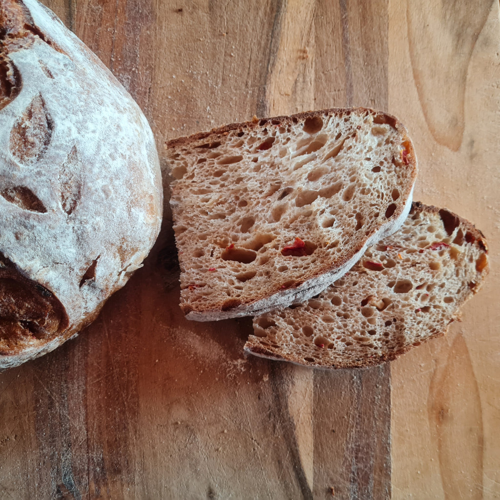 Összetevők: Búzaliszt, teljeskiőrlésű búzaliszt, víz, természetes kovász (búzaliszt, víz), só, aszalt paradicsom, fokhagyma Allergének: glutén A termék olyan üzemben készül, ahol glutént tartalmazó gabonákat, tejet, tojást, szezámmagot, földimogyorót, dióféléket, valamint szóját, kén-dioxidot és szulfitokat tartalmazó alapanyagokat is feldolgoznak. A Péklapát pékműhely termékeit szerda 14 óráig tudod csak a kosaradba tenni.